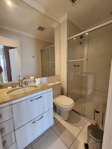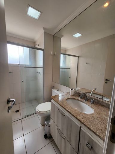 Banheiros com gabinete, box blindex, espelhos e duchas.