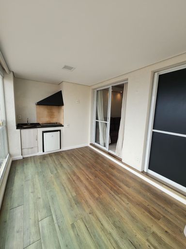 Varanda gourmet com churrasqueira, pia e armários, cortina rolo e envidraçamento.