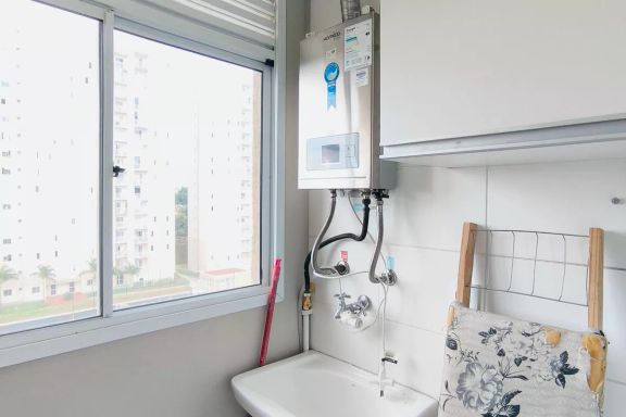Área de serviço com armários e aquecedor à gás