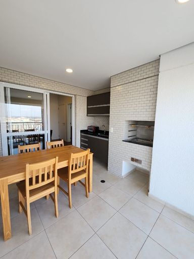 Sala de estar e jantar integradas à varanda gourmet com churrasqueira, pia com gabinete e envidraçamento
