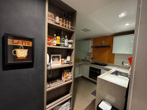 Cozinha com armários planejados, cooktop, forno e coifa, balcão para refeições rápidas, despensa, área de serviço com armários e banheiro