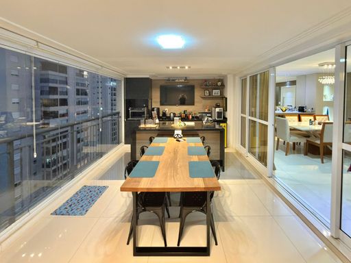 Varanda gourmet com churrasqueira, balcão, pia, armários, TV, envidraçamento e cortina rolo. Sol da manhã