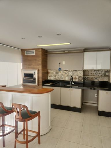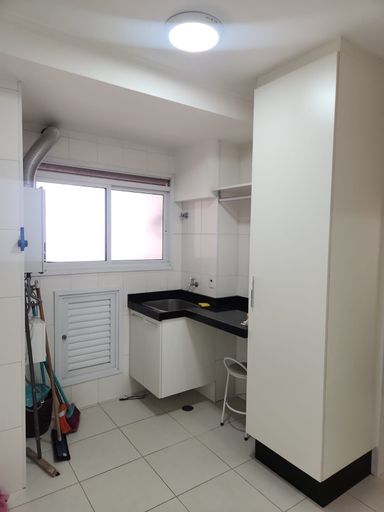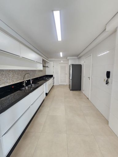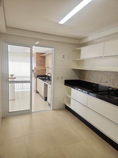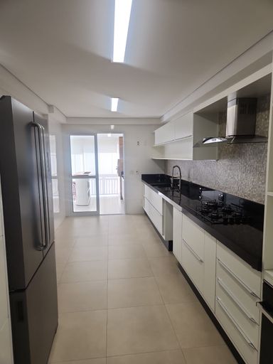 Cozinha com armários planejados, cooktop, forno e coifa, área de serviço, despensa, banheiro de empregada.