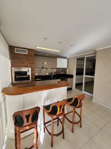 Varanda gourmet com pia, armário, churrasqueira, toda envidraçada e com cortina rolo. Lavabo, espaço para escritório ou fazer mais um dormitório