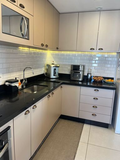 Cozinha repleta de armários planejados, cooktop, forno e coifa embutidos, ampla área de serviço