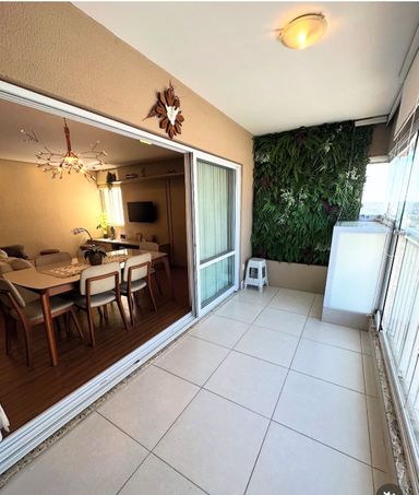 Sala de jantar e sala de estar, integradas à  varanda gourmet com churrasqueira de inox, pia em granito com gabinete, toda fechada com churrasqueira, envidraçamento e cortina.