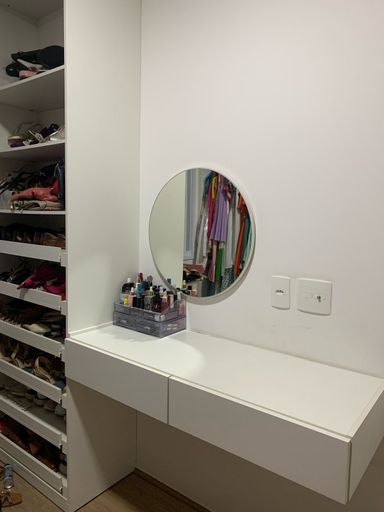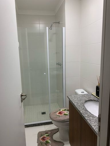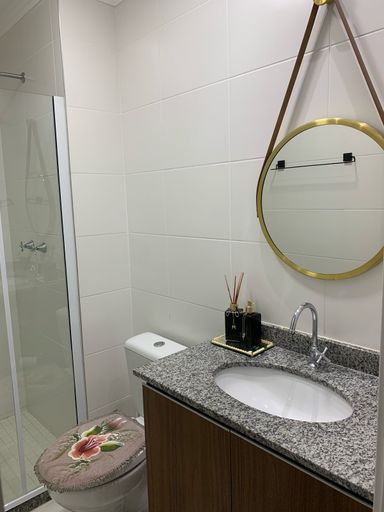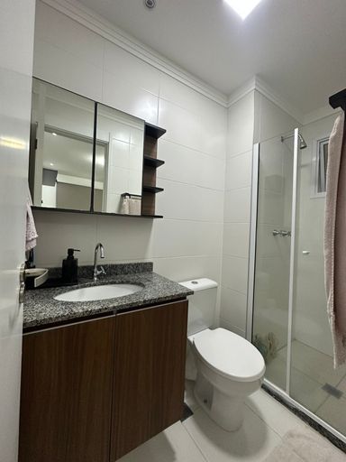 Banheiros com gabinete, box blindex, ducha e espelho