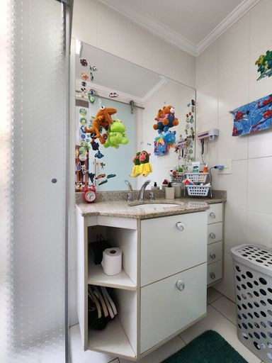 Banheiros com gabinete, espelho, box de vidro e ducha