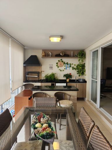 Varanda gourmet envidraçada com churrasqueira, pia, armários, cortina blackout