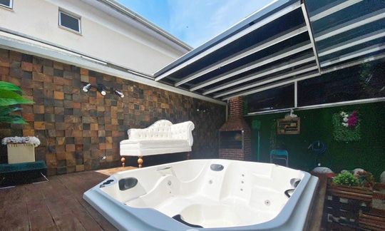 Amplo quintal com área gourmet coberta no mezanino com pia e churrasqueira, banheiro externo