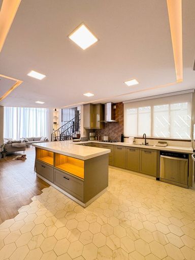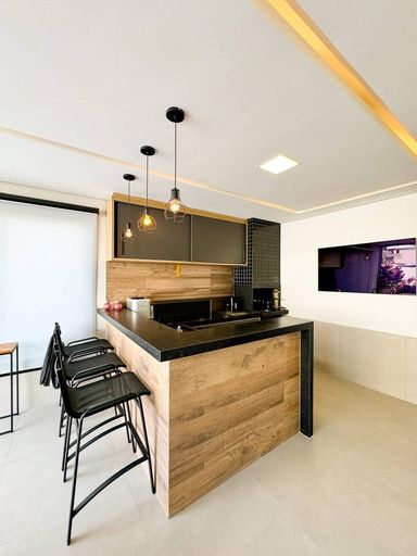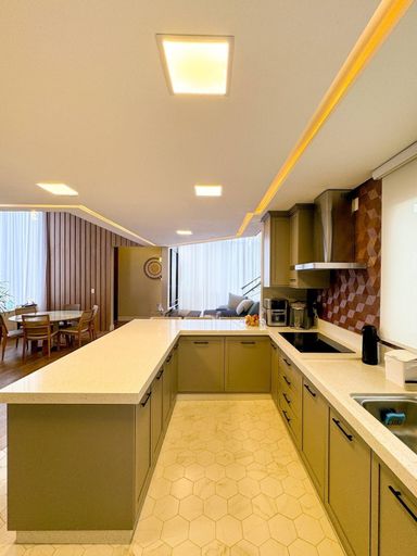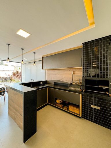 Cozinha repleta de armários e eletros, área de serviço e corredor lateral com depósito