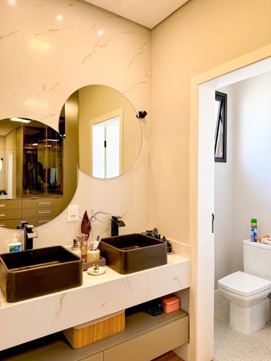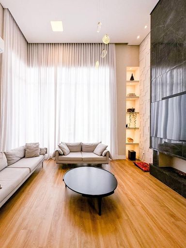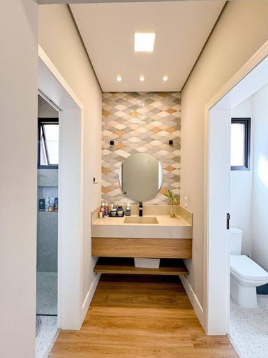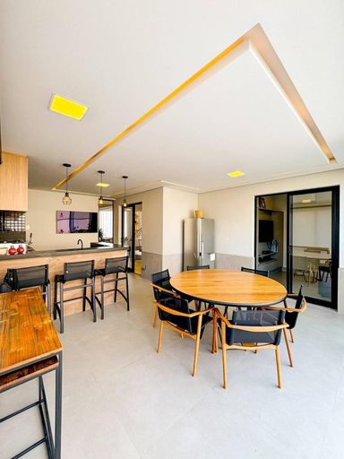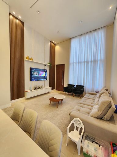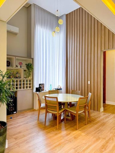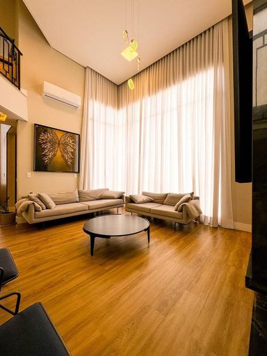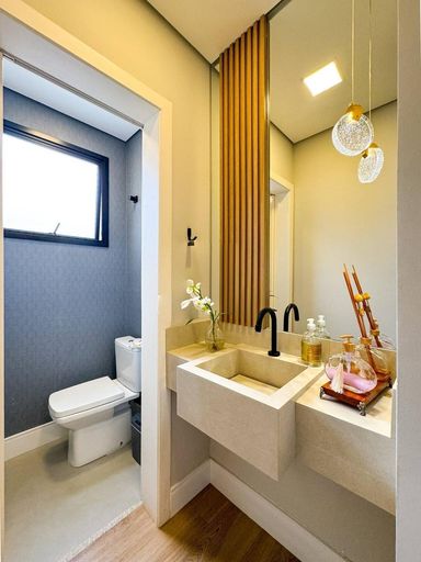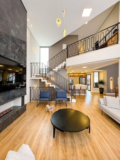 Lavabo, sala de estar e sala de jantar com pé direito duplo, lareira e varanda