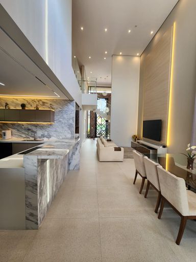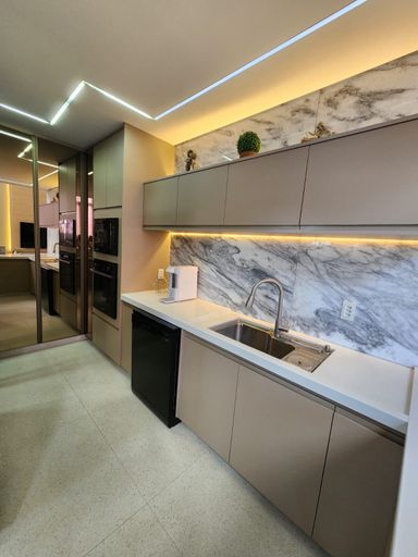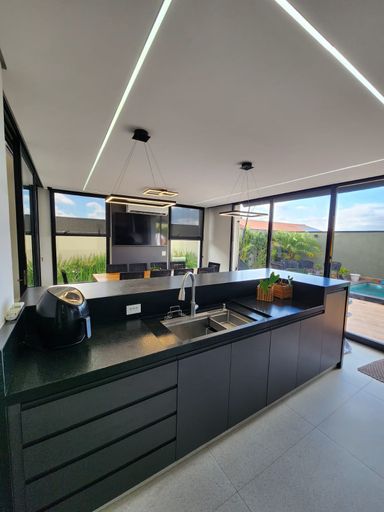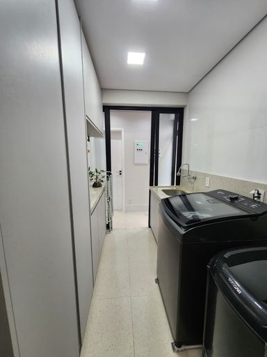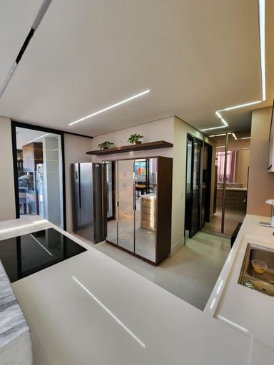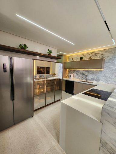 Cozinha em conceito aberto, repleta de armários e eletros, área de serviço, despensa, corredor lateral com depósito