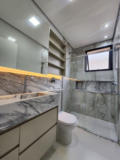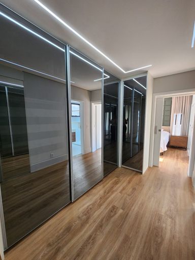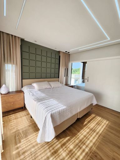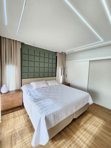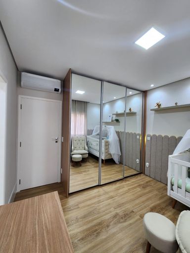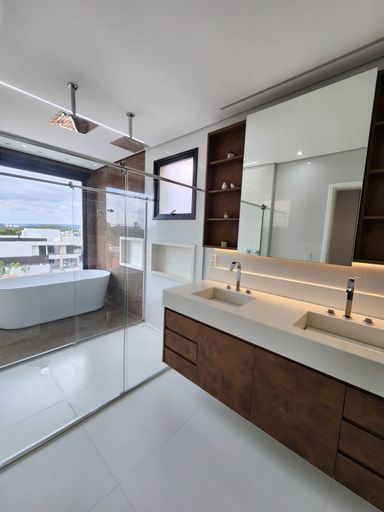Parte superior com 3 suítes, todas com armários planejados e ar condicionado, sendo uma master com amplo closet, varanda e banheira