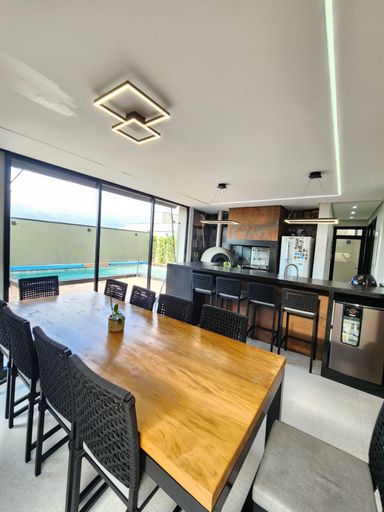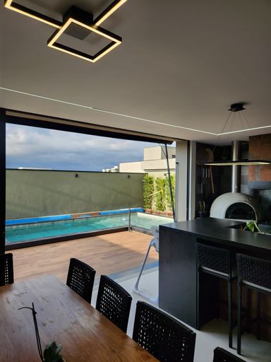 Área gourmet com churrasqueira, forno de pizza, pia, balcão de apoio