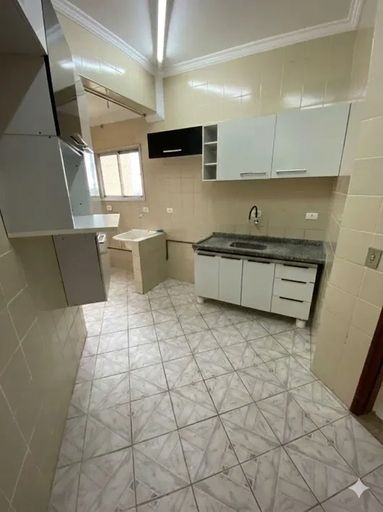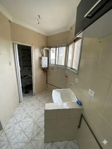 Cozinha com armários planejados, área de serviço e banheiro de serviço.