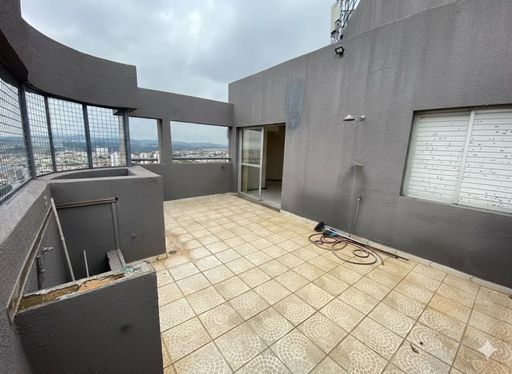Parte superior com amplo terraço. uma sala e um banheiro