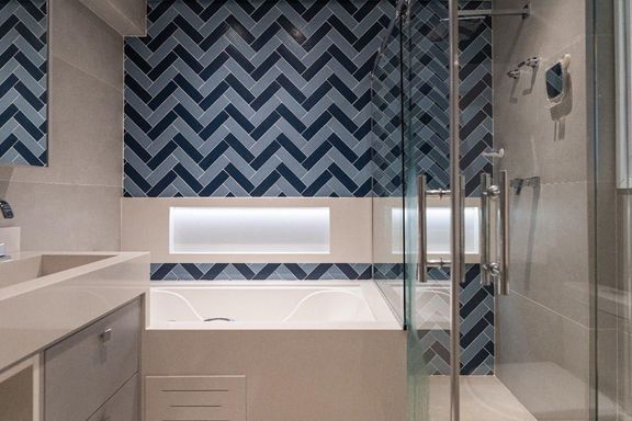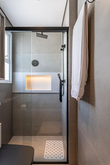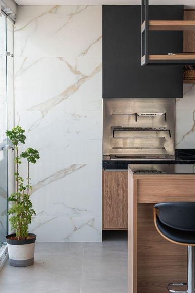 Varanda gourmet com churrasqueira, pia, envidraçamento e cortina rolo