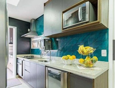Área de serviço com armários, despensa, banheiro e entrada de serviço.