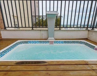 Amplo terraço com jacuzzi e deck, com vista deslumbrante