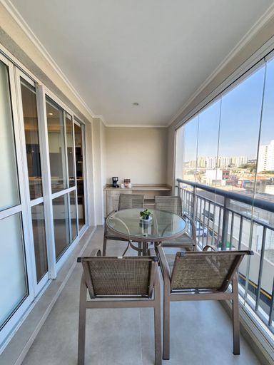 Varanda espaçosa com envidraçamento, mesa de vidro e 4 cadeiras