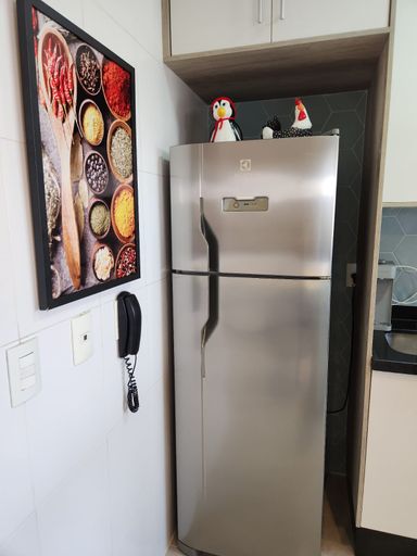 Cozinha estilo americana com armários planejados, cooktop, geladeira, airfryer, , liquidificador, cafeteira e microondas
