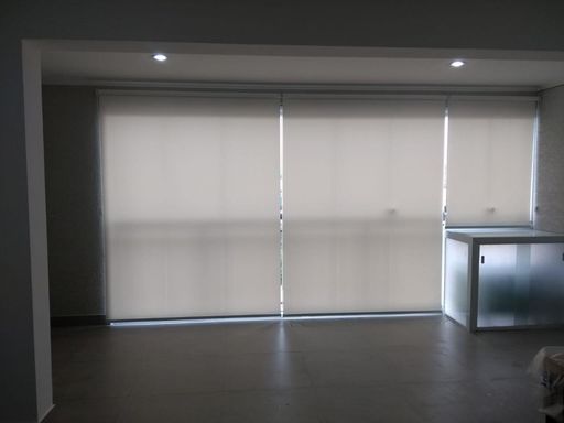 Varanda espaçosa integrada ao apto, envidraçada e com cortina
