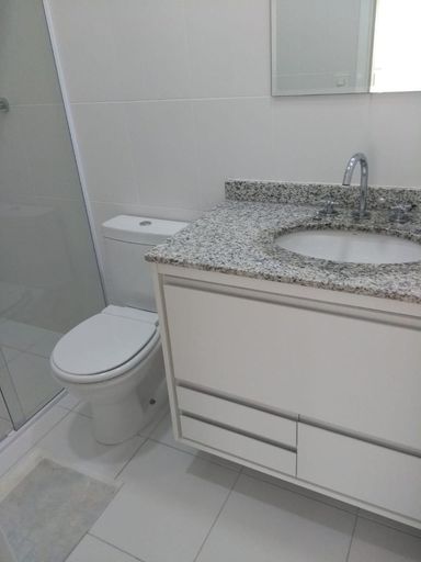 Banheiro com gabinete, espelho, box blindex e ducha.