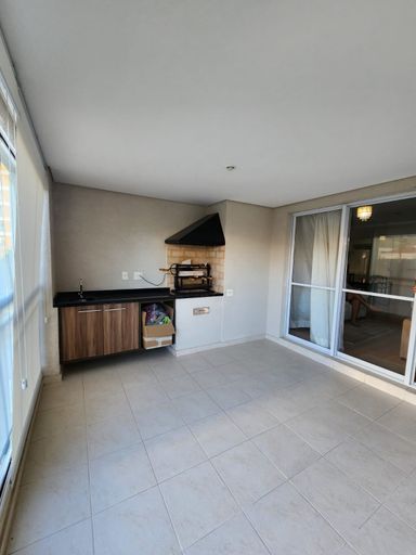 Varanda gourmet com churrasqueira a carvão, pia com gabinete, cortina rolo e envidraçamento. Sol da manhã.