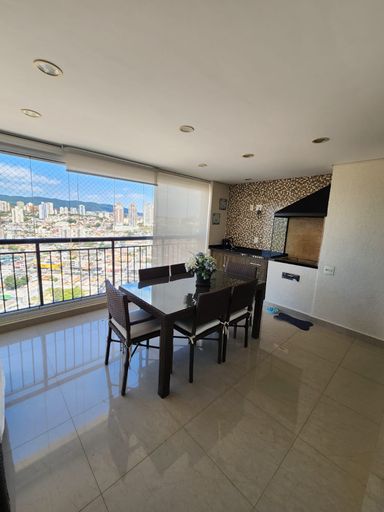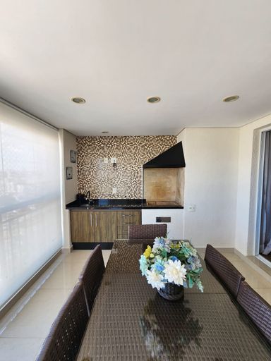 Varanda gourmet com churrasqueira, pia com gabinete e envidraçamento.