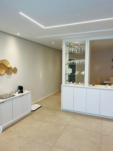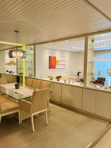 Sala de estar, jantar e TV, teto todo trabalhado em gesso e iluminação diferenciada, lavabo