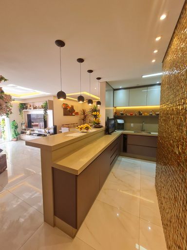Sala de jantar e sala de estar com home para TV, ar condicionado, teto rebaixado e com iluminação diferenciada