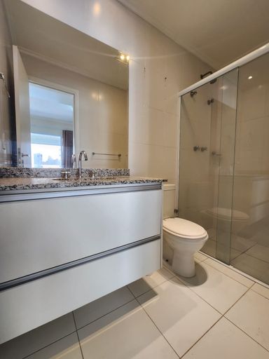 Banheiro com gabinete, espelho, box blindex e ducha