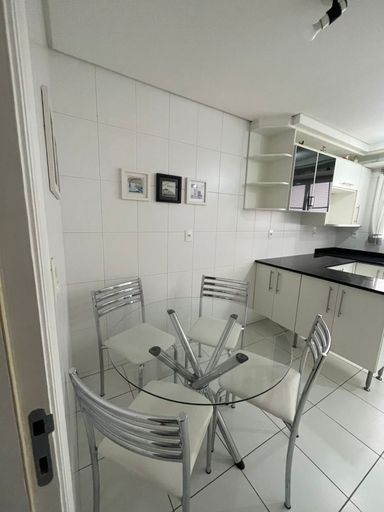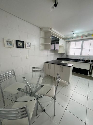 Cozinha equipada com armários e mesa para refeições rápidas