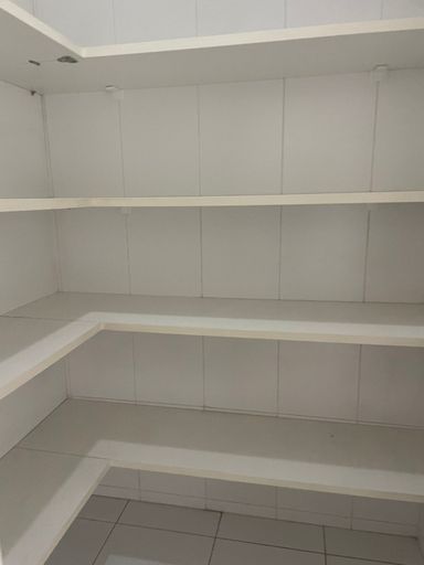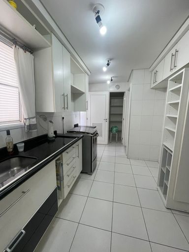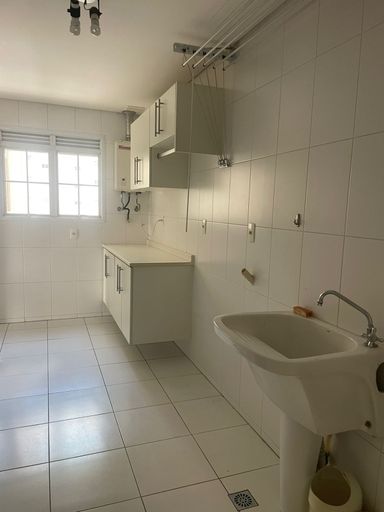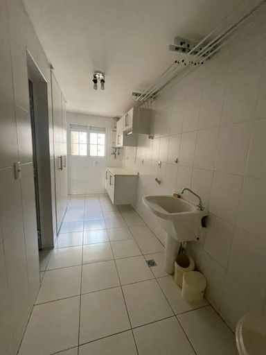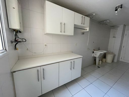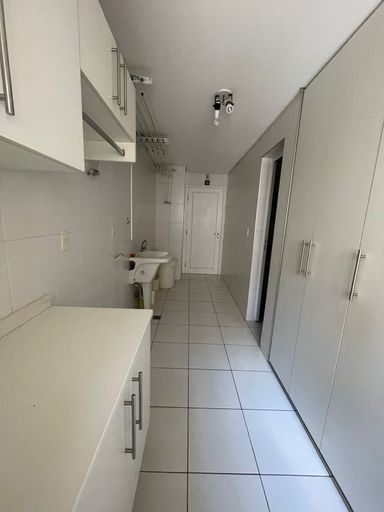 Área de serviço com armários planejados, despensa e banheiro de serviço.