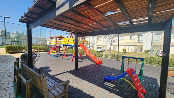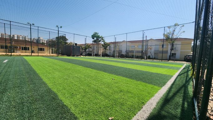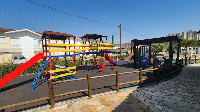 Condomínio com área de lazer completa: churrasqueira, piscina adulto, piscina infantil, salão de festas, salão de jogos, playground, quadra poliesportiva, campo de futebol gramado, brinquedoteca, academia, estacionamento para visitantes.